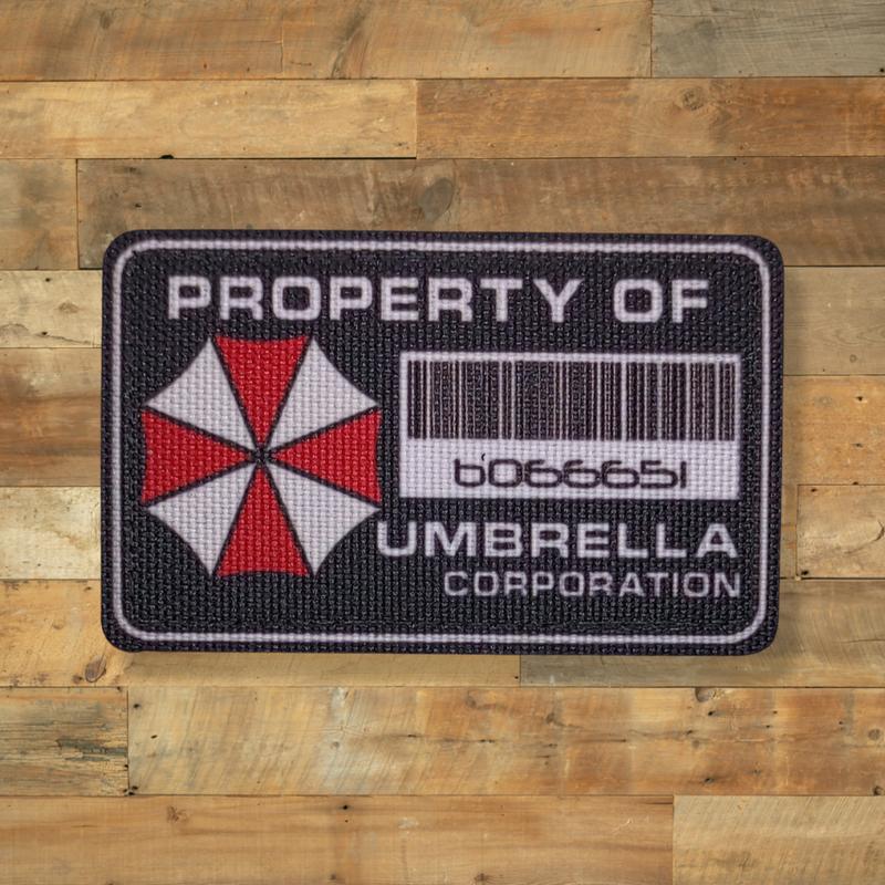 Property of Umbrella Corp. (Собственность Корпорации Амбрелла), патч печатный. Размер - 8х5 см. Способ крепления - липучка (велкро). Способ изготовления - Сублимационная (водостойкая) печать. Прошивка по контуру патча. Использованы водо и износостойкие материалы. Лазерная обработка края.