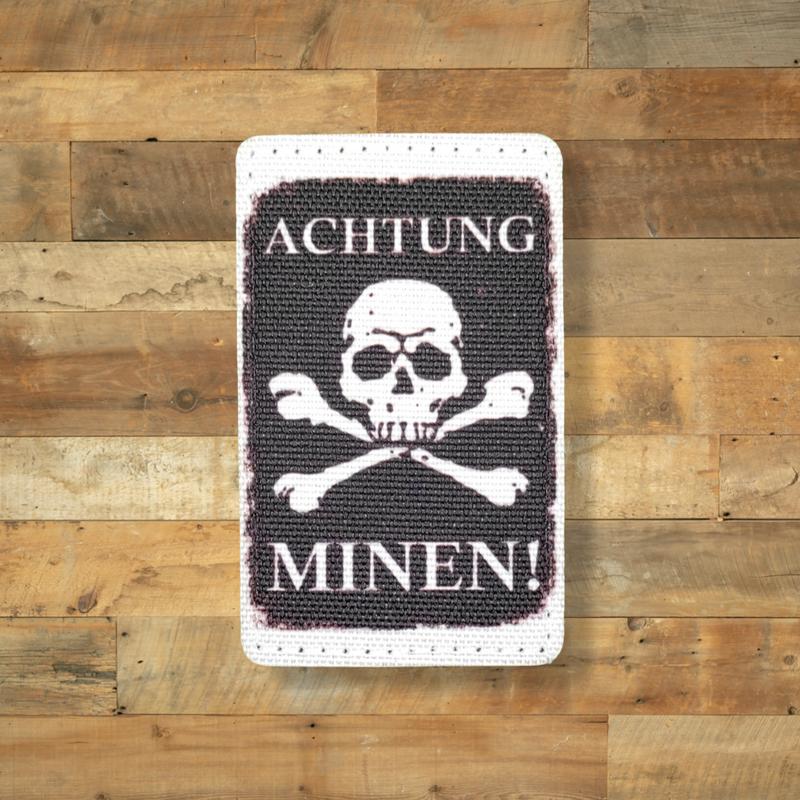 Achtung Minen! (Внимание Мины!), патч печатный Размер - 8х5 см Способ крепления - липучка (велкро) Способ изготовления - сублимационная (водостойкая) печать Использованы износо и водостойкие материалы. Лазерная обработка края. Основа - ОКСФОРД 600