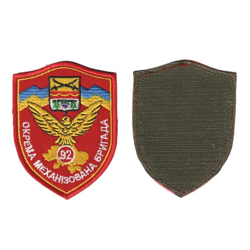 Шеврон військовий / армійський, 92 окрема механізована бригада, на червоному, ЗСУ. 9,5 см * 7,5 см