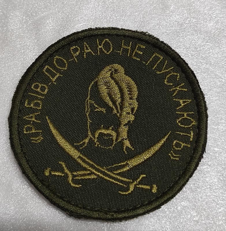 Шеврон, нашивка, наклейка, патч "РАБІВ ДО РАЮ НЕ ПУСКАЮТЬ" Виконаний матеріалом кольору oliva і вишитий ясно зеленими нитками; Кріпиться на липучці; Розмір 8 см на 8 см;