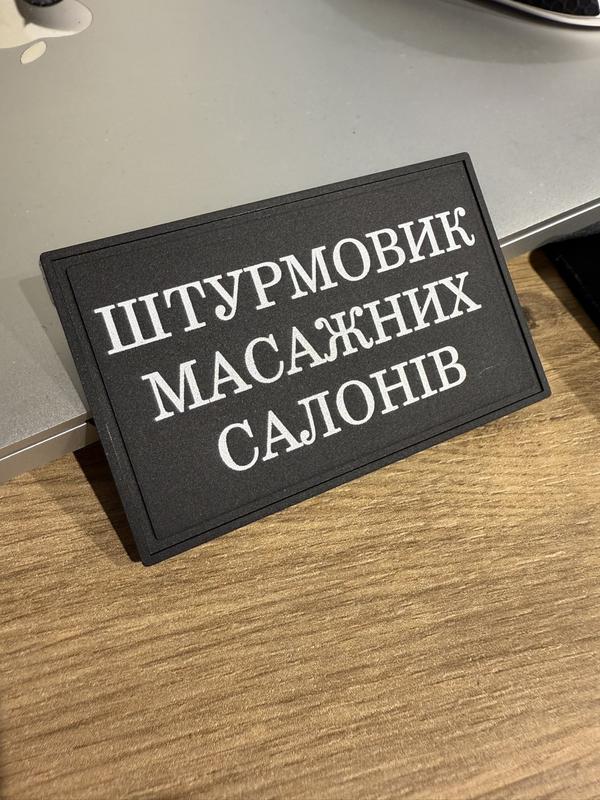 Шеврон «Штурмовик масажних салонів» Матеріал пвх. Зображення нанесено уф друком. Розмір 50 мм на 80 мм.