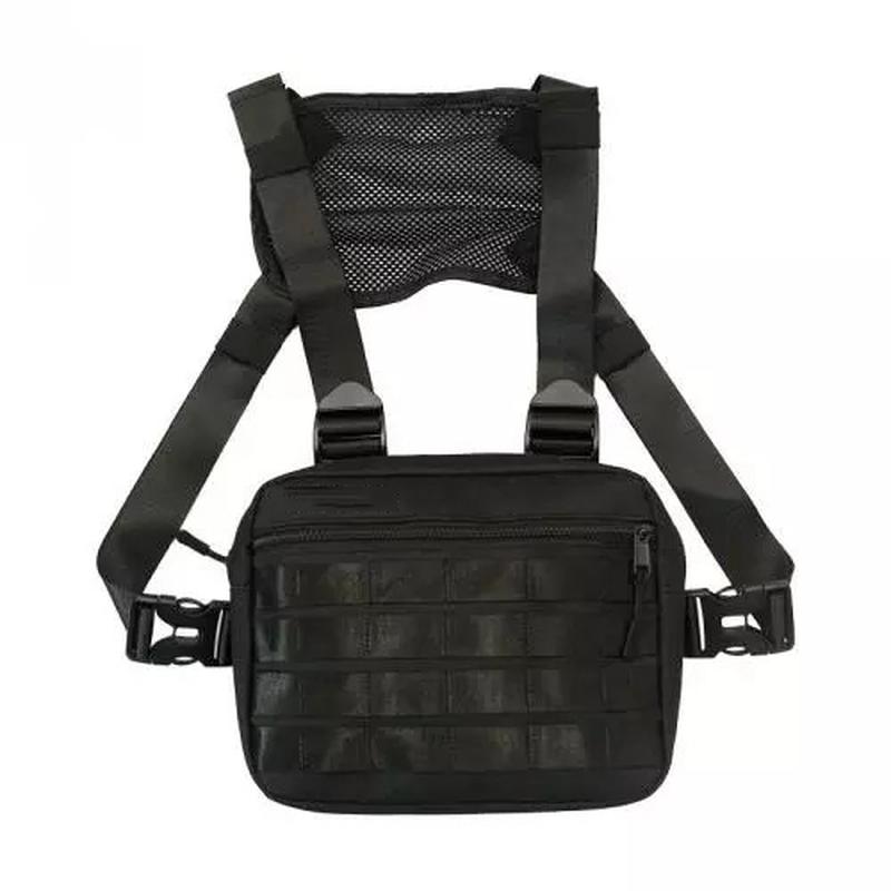 Сумка жилет на груди досить містка. У неї легко поміститися телефон, ключі, гаманець та інші потрібні дрібниці, причому ви зможете бути на 100% впевнені в їх збереженні: вони завжди будуть у вас перед очима, і в потрібний момент дістати якусь річ зовсім не важко. > Тактичний жилет має одне основне відділення, кишеню на лицьовій частині та систему Molle для підвішування додаткового спорядження. За рахунок цього подібна стане в нагоді і в похідних умовах. Сумка виготовлена з щільного матеріалу з водовідштовхувальним просоченням, що надійно захищає цінні речі від промокання, і завдяки цій же якості характеризується підвищеною зносостійкістю. Прекрасний варіант для поїздок на полювання, рибалку. Характеристики: Система Molle; Розміри: 35 х 18 х 10 см; Матеріал: нейлон; Об’єм: 6.4 л; Колір: чорний. Комплектація: Сумка-жилет нагрудна.