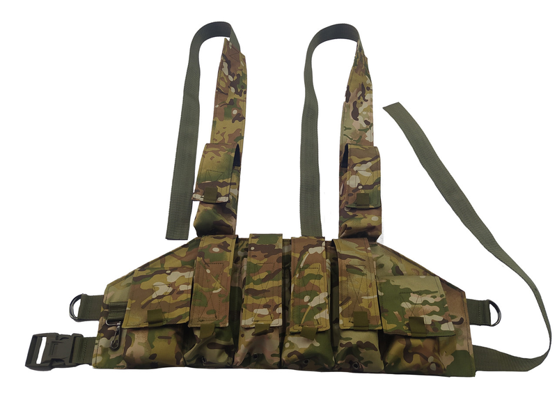 Розвантажувальна система нагрудна закритого типу А для магазинів серії «АК», «AR/M4», «AR-15 MFT», «AR30» місткістю 30 набоїв. Система має вісім відділень: 4 відділення для магазинів, 2 відділення для виробів серії «Ф1/РГД-5», «М67/М67-П», два відділення на плечових для рації та турнікету. Відділення закриваються окремими клапанами з велкро. Комплектується карабіном. Розмір універсальний, регулюється стропами. У кожному відділені є отвір для відведення вологи. Колір: мультикам. Матеріал: Оксфорд 600D PU, водовідштовхуючий.