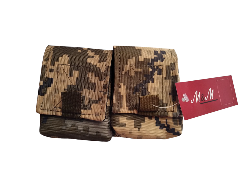 Тактичний підсумок для розміщення, зручного транспортування та зберігання двох ручних гранат серії «М67» та «П-М67. Клапан підсумка закривається на широку липучку велкро. Система кріплення MOLLE, яка додатково оснащена фіксацією кнопками, що дозволить Вам кріпити цей підсумок на всі сучасні модульні та розвантажувальні системи. В нижній частині підсумка передбачений дренажний отвір для стоку води. Матеріал: Оксфорд 600D PU, водостійкий. Колір: Вид 5 ММ-14 піксель.