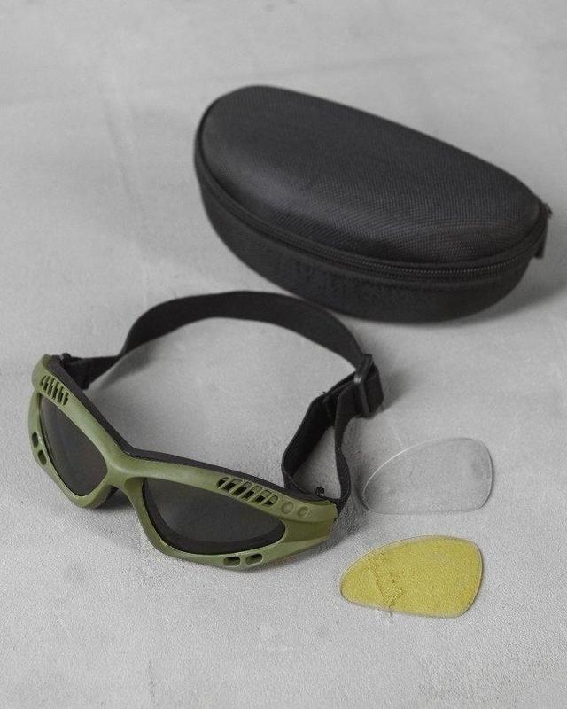 3 змінні лінзи в комплекті. Можна використовувати за будь-якої погоди. Лінзи мають спеціальне покриття, яке забезпечує антитуманний захист, не запітніють, захист від дрібних подряпин. Захищають від уламків, бруду, землі. Мають широкий кут зору завдяки вигнутій формі. Регульований ремінь дозволяє зручно кріпиться як на голову, так і на шолом. При використанні зверху шолома рекомендується використовувати чохол ( входить до комплекту)