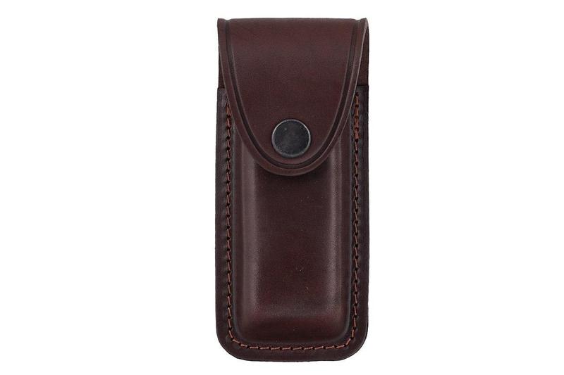 Чехол для складных и многофункциональных ножей из натуральной кожи коричневого цвета с фиксатором в виде кнопки. Кнопка - это очень надежная фиксация клапана, исключающая случайное раскрытие. Чехол изготавливается из ременной кожи толщиной 3-3.5 мм, прошит капроновой нитью в цвет кожи. Подходит для ношения на ремне шириной до 50 мм. Чехлы от Svarog также подойдут для ношения небольшого фонарика, огнива или брусочка для правки ножа.
