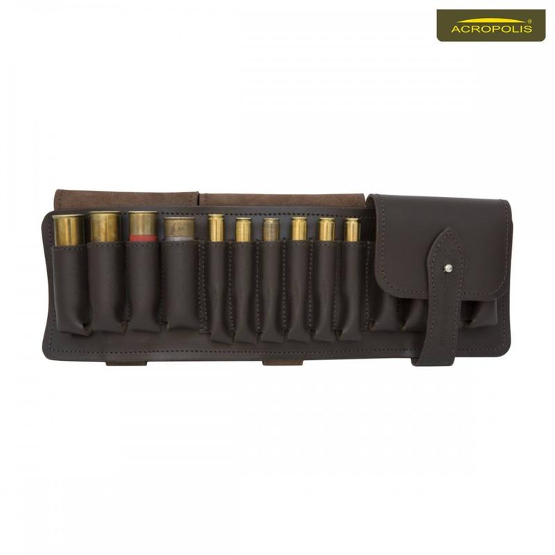 Размер: Ширина пояса: до 6 см. Материал: натуральная кожа (тиснение), кобурные винты, хольнитены. Трехсекционный футляр для патронов комбинированного оружия: первый и третий секции рассчитаны на 4 гладкоствольных патроны 12-16 калибра каждая; второй секция - на 6 патронов нарезного оружия 30-06. Футляр изготовлен из кожи, имеет рельефное тиснение, крепится на пояс. Футляр комбинированный Акрополис ФПК-1 для различных патронов пользуется популярностью среди молодых и опытных охотников. Надежный производитель хорошо зарекомендовал себя среди покупателей охотничьих магазинов.
