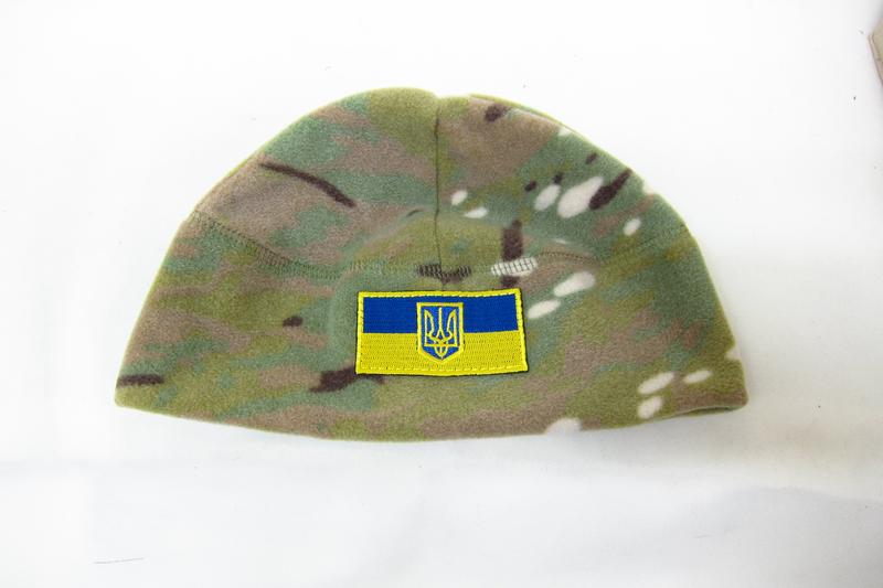 Шапка військова зимова флісова,забарвлення мультикам. Спереду пришит шеврон прапор України великий. Розміри S{55-56} M{57-58} L{59-60}.
