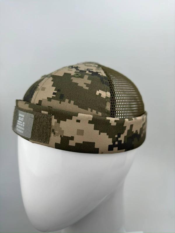 Колір :Мультикам 📌 Докерка - кепка без козирка, з ліпучкою та сіткою по боках 🧵Матеріал: бавовна 65%, поліестер 35% 📏Розмір: 55-57, 58-60 ✔️Гарна якість, регулюється на ліпучці 🎨Колір - мультик 🪖Під шолом 🇺🇦Виробник Україна