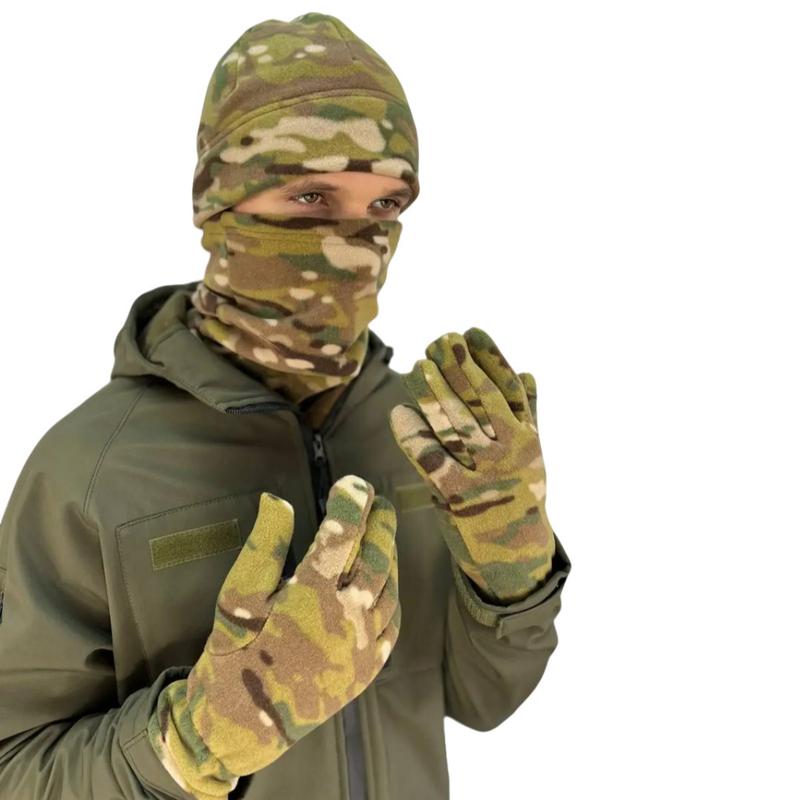 Комплект (шапка, бафф, перчатки) - це ідеальне поєднання, будь готовий до будь-яких погодних умов. Захистіть своє обличчя та руки від морозного та холодного повітря, будь те завжди в затишку та теплі. Комплект виглядає дуже стильно все одному кольорі. Чудовий подарунок як для когось так і для себе. Тепла шапка та бафф з флісу щільністю 250 грм2, перчатки з флісу щільністю 280 грм2. Виготовляється з м'якого та теплого матеріалу. Дуже приємний на дотик та непродуваємий вітром. Бафф оснащено фіксатором затяжка-гумка, для затягування та більш щільнішого прилягання тканини до тіла. Останнім часом у морозні часи чудово себе зарекомендували вироби із флісу. Завдяки більщій щільності матеріалу витримує нищі температури і відповідно краще захищає від уражень холодом, морозостійкий. Цей матеріал фактично не втрачає своїх властивостей під час носіння, не дратує шкіру, не розтягується, легко стирається та швидко сохне. Саме тому його обирають як виробники так і споживачі. Шапка міцно сидить на голові. Можна використовувати під шолом. Має стильний дизайн та анатомічний крій. Матеріал: фліс 250-280 грм2; Колір: мультикам; Розмір шапки: 55-57 см; Розмір перчатки: універсальний; Розмір бафф: L - 27,5х26 см.