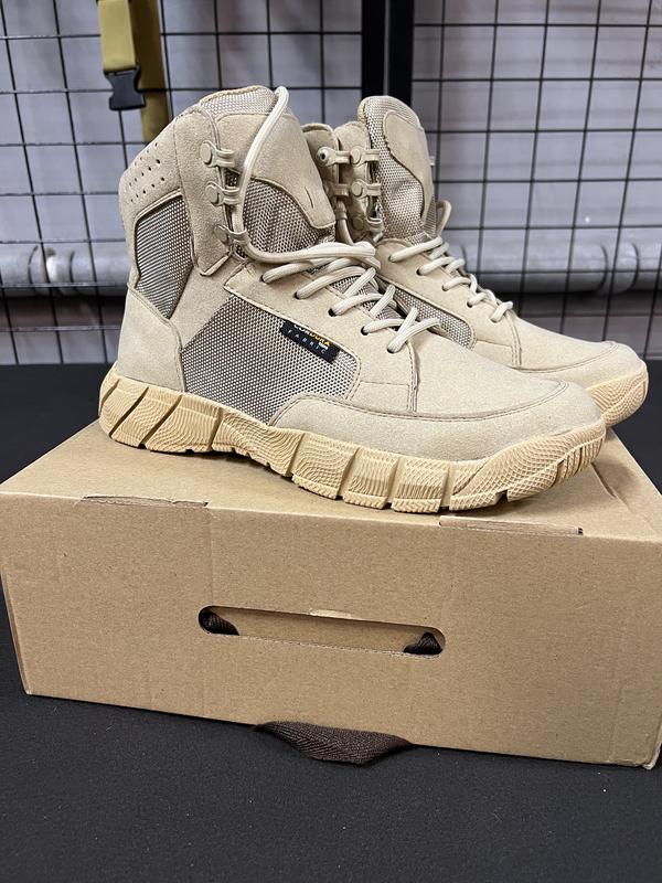 Легкі та повітряні тактичні черевики мають комбінований верх зі шкіри та м’якого текстилю кольору пустельного піску. Двокомпонентна підошва забезпечує ефективне поглинання ударів при ходьбі. Черевики оснащені системою швидкого шнурування і підходять для службових цілей професіоналів та аматорських військово-спортивних багатоборств. Їх також можна використовувати для проведення дозвілля або туристичних подорожей. Виробник: фабричний Китай дуже гарної якості. Підходять як для чоловіків так і для жінок (унісекс) Розміри: 42, 43, 44, 45