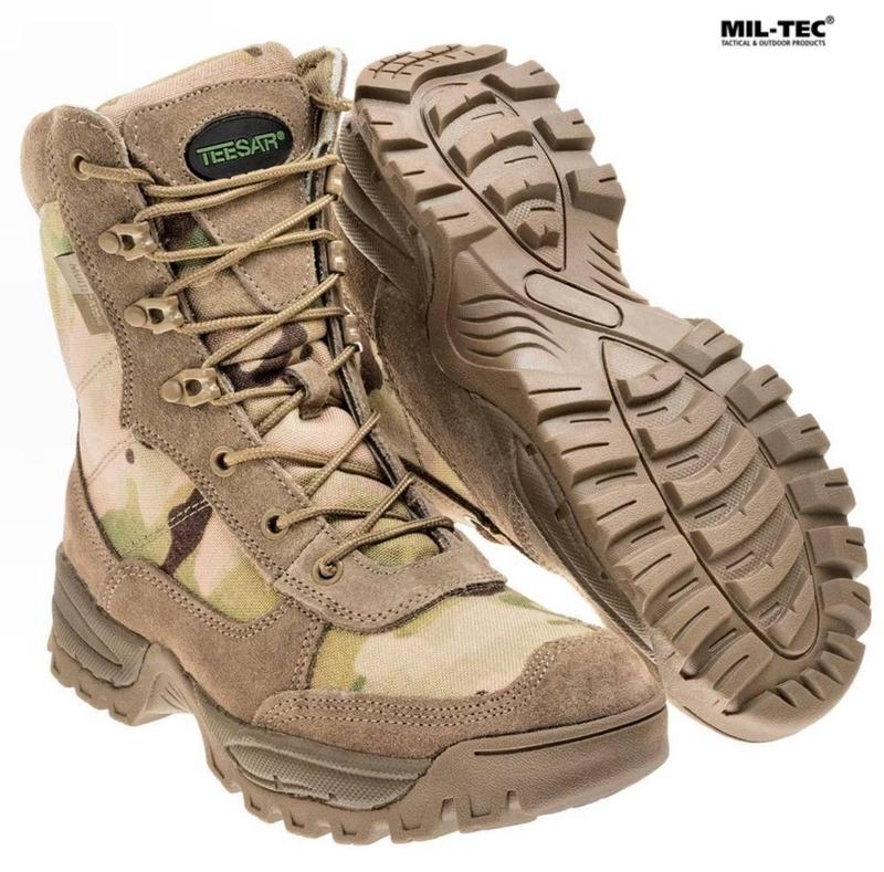NEW NEW NEW 🆕🆕🆕 Швидкі терміни відправки 🚚📦 Черевики Mil-Tec Teesar Tactical One Zip - MultiCam Артикул : Розміри : 41,42,43,44 Черевики Mil-Tec Teesar Tactical One Zip - MultiCam від німецького бренду Мі-Тес - це універсальне тактичне взуття з високим берцем, призначене для військових, правоохоронців, учасників стройових занять, а також для використання як міське та позашляхове взуття. Виготовлені з комбінації натуральної замші та міцного поліестру в камуфляжі MultiCam, що забезпечує вентиляцію та довговічність. Оснащені системою швидкого надягання з блискавкою YKK по всій довжині берця та металевими вушками для швидкої шнурівки з міцного поліестру. Внутрішня устілка з піни EVA забезпечує комфорт при тривалому використанні, а гумова підошва з технологією EVA та протектором гарантує амортизацію і стабільність на мокрих або сипучих поверхнях. Посилені пʼята та носок додають захисту й комфорту. Вага черевиків становить приблизно 1116 г (розмір 42). Черевики підходять для цілорічного використання в різних умовах. Характеристики: - Матеріал: Натуральна замша, поліестр, підошва - гума з EVA, устілка - піна EVA - Особливості: Блискавка YKK, швидка шнурівка, посилені пʼята та носок, вентиляція, ергономічна підошва - Вага: ~1116 г (розмір 42) - Виробник: Mil-Тес, Німеччина