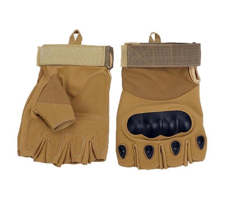 Тактические перчатки без пальцев с протектором. Имеют уплотненные защитные накладки на пальцах и костяшках, а также антискользящие вставки на ладонях. Застежка-липучка. На запястье предусмотрены небольшие петли для удобства транспортировки. Подойдут для использования в демисезон или летом. Смотрите таблицу размеров.