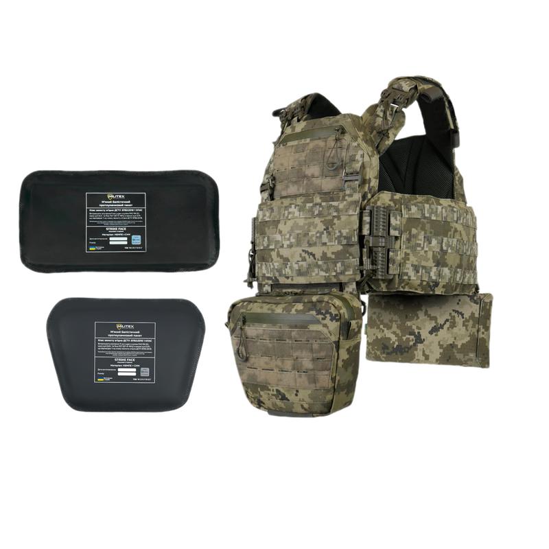 В комплекті - Плитоноска швидкого скидання CEN.2. 1 шт -Напашник XL з карманом під балістичний пакет 1 шт - Захист попереку 1 класу з балістичним пакетом 30,5*13,5 см Militex мультикам - Балістичний пакет Militex для сумки-напашника XL 25,5*16*17 1 клас захисту Плитоноска оснащена з’ємною передньою Molle панеллю яка кріпиться до основи на Velcro та додатково двома карабінами Woojin. На ній зручно розміщуються 3 підсумки під 1 або два магазини, або інше Molle-сумісне спорядження. Цю панель можна швидко замінити на іншу із закрікленим на неї заздалегідь набором потрібних підсумків. Матеріал Cordura Nylon 6.6 1000D з NIR-просоченням Плити 25*30 см Бокові кармани під балістичні пакети 13,5*30,5 см. Характеристика плитоноски Матеріал: Виготовлена з Cordura Nylon 6.6 1000D з NIR-просоченням, що забезпечує виріб меншу помітність у приладах нічного бачення. Тканина має подвійне поліуретанове покриття для захисту від вологи та мастильних матеріалів, не підтримує горіння, не стирається, не вигорає на сонці. Сумісність: Підходить для бронеплит розміром 25*30 см зі скошеними верхніми кутами і товщиною до 30 мм (металеві або керамічні). Бокові кишені: Оснащена кишенями під балістичні пакети 13,5*30,5 см. Система Molle: Плитоноска має велкро панель з Luser Cut Molle на верхній частині, а також чотири ряди строп Molle на фронтальній частині та три ряди строп Molle на камербандах. Елементи захисту: Підходить для установки балістичних пакетів першого або другого класу від компанії Militex. Швидке скидання: Має подвійний механізм швидкого скидання в зоні плечей та камербандів для швидкого зняття плитоноски. Комфорт: Має ергономічні плечові лямки з м’яким демпфером та 3D-сіткою для більшого комфорту і правильного розподілу навантаження. Додаткові функції: Регульована система по довжині та об'єму. Д-кільця спереду та ззаду для кріплення додаткового спорядження. Велкро панель для розміщення патчів, Molle-спорядження та невеликого адміністративного відділення. Демпферні вставки: Внутрішня частина плитоноски має демпферні вставки обшиті 3D-сіткою для амортизації та правильної циркуляції повітря. Камербанди: З'ємні, з м'якими демпферами обшитими 3D-сіткою та кишенями під балістичні пакети 13,5*30,5 см Евакуаційна ручка: Ручка для евакуації, яка фіксується до спинки велкро- панелями. Ця плитоноска має високий рівень функціональності та надійності для захисту користувача в різних умовах. Балістичний пакет 1 класу Militex для напашника XL 25,5*16*17 чорний Балістичний пакет Militex 12×30 1 класу чорний Балістичні пакети від Militex створені для надійного захисту від пістолетних куль, дрібних уламків та вторинних вражаючих елементів. Вони складаються з м’яких, гнучких та легких панелей різної форми. Основні матеріали, використані в пакетах Militex, включають: Надвисокомолекулярний поліетилен високої щільності (UHMWPE) бренду Dyneema®️, що відомий своєю стабільною якістю. Синтетичний нетканий матеріал (Кевлар) як додатковий демфер для зниження позаперешкодної травми. Чохол з водонепроникної тканини з поліуретановим покриттям, забезпечуючи надійність та якість. Процес виробництва включає точну лазерну порізку балістичних матеріалів та ультрозвукову запайку країв чохла. Бронепакет MILITEX витримав постріли: - пістолетною кулею калібру 9х18 мм (швидкість 341±1 м/c) зі сферичною головною частиною зі сталевим нетермозміцненим осердям у сталевій оболонці, плакований томпаком, 