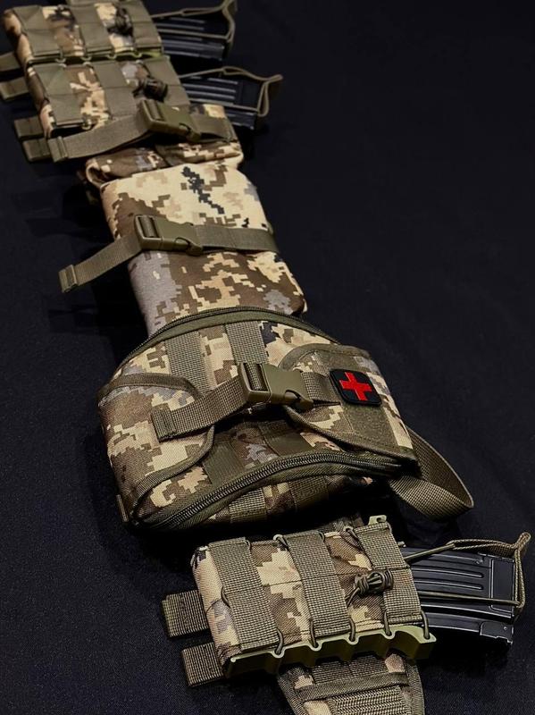 Комплект РПС з ремнем на фастексі та 6 підсумків До комплекту входять: -РПС та ременем на фастексі з системою "Lock"; -підсумок під аптечку швидкого скидання; -сумка для скиду; -підгранатник; -підсумок під магазини, 3 шт (або каркасний підсумок під магазини, 3 шт) Довжина ременя регулюється від 125 см до 95 см, ширина 5 см. Розмір підкладки 90*10 см РПС оснащений кріпленнями для подальшого використання плечиків та ремнем з надійною, металевою застібкою. Ремінь змінний. В середину вшита помякшуюча підкладка що слугує додатковим демфером. РПС оснащений дихаючою 3D сіткою з внутрішньої сторони, що робить його більш комфортнішим у використанні. Зовнішня сторона оснащення системою моллі з міцної та надійної поліамідної стропи, для кріплення підсумків та іншого додаткового спорядження. Все прошито армованими нитками, що підвищує термін служби виробу.