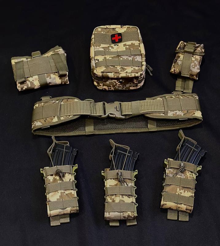 В комплекті Розвантажувальний ремінь РПС факсекс 1 шт Тактична сумка для сбросу пустих магазинів 1 шт Нейлоновий підсумок для тактичної аптечки 1 шт Підсумок з для АК з пластиковими боками 3 шт Підсумок під гранату 1 шт 1.Розвантажувальний ремінь РПС Без плечиків!!! Довжина ременя регулюється від 110 см до 95 см. Розмір підкладки 90*10 см РПС оснащений кріпленнями для подальшого використання плечиків та ремнем "фастексах" на магнітній застібці. Ремінь змінний. В середину вшита помякшуюча підкладка що слугує додатковим демфером. РПС оснащений дихаючою 3D сіткою з внутрішньої сторони, що робить його більш комфортнішим у використанні. С зовнішньої сторони система моллі з міцної та надійної поліамідної стропи, для кріплення підсумків та іншого додаткового спорядження. Все прошито армованими нитками, що підвищує термін служби виробу. 2Тактична сумка для сбросу пустих магазинів. Розмір: 27 х 25 см Виготовлена з водонепроникної тканин Оксфорд 600D, якісна фурнітура, система молі. 3 Нейлоновий підсумок для тактичної аптечки Характеристики: Матеріал: Водонепроникна міцна тканина 600d Кріплення: на стегно, MOLLE Зовнішні габарити: 19 см х 16 см х 10 см 4 Підсумок з пластиковими боками призначається для носіння одного магазину АК або М16, як на розвантажувальних жилетах і бронежилетах, так і на будь-якому спорядженні, оснащеному кріпленням MOLLE. На звороті підсумка розташоване кріплення MOLLE з фіксацією ремінців на кнопці. Матеріал Cordura 16×7×3,5 см