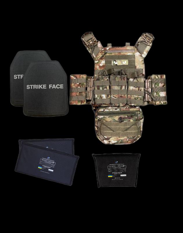 Звертаємо Вашу увагу, що фурнітура може відрізнятись по кольору, в залежності від партіі поставки. Можливо добавити балістичний захист або підсумки , РПС і так д. До комплекту - плитоноска 1 шт. -Тройний підсумкок під магазини АК 1 шт -Напашник 1 шт -Шеврон очі мультикам 1 шт -Комплект балістичних пакетів боковий карман STRIKE FACE 30*15 см 1й клас з 2 шт -балістичний пакет в напашник STRIKE FACE 20x16.5x13.5 см 1 клас захисту 1 шт -Комплект керамічних плит 30*35 см Tarkus Guard Tactical Threat Level 4 (6 клас ДСТУ) вага 2.85 кг однієї з 2 шт бокові кармани під м'які балістичні пакети 15*30 см Якісна плитоноска за стандартом НАТО оснащена боковою та верхньою системою швидкого скидання, під плиту 25×30 см. - Розмір плитоноски універсальний, регулюється на плечах та по об'єму від М до XXL. - З середини прошита 3D сіткою та пом'якшуючою підкладкою, що слугує додатковим демпфером. - Позаду оснащена евукаційною ручкою. - По верху прошита системою Molle, що дозволяє кріпити будь-які підсумки та інше додаткове спорядження. - По переду вшитий додатковий карман на блискавці для особистих потреб. - Бронеплити вставляються знизу та фіксуються широкою системою липучок, що не дасть вашим плитам випасти чи протерти кріплення. Виготовлена з міцної, водонепроникної тканини Кордура 900D. Для пошиву використовується поліамідна стропа. Для її виготовлення використовується стійкий до зносу, суперміцний, високоякісний поліамід. Має відмінні властивості: високий рівень міцності, надійна, зможе витримати великі навантаження, стійка до негативного впливу ультрафіолету, вологи, високих/низьких температур, довговічна. Відповідає вимогам вітчизняних стандартів якості. Плитоноска прошита армованими нитками, що підвищує термін служби виробу. Комплект балістичних пакетів STRIKE FACE 30*15 см 1й клас 1 й клас згідно ДСТУ 8788:2018 Матеріал: надвисокомолекулярний поліетилен (НВМПЕ) виробництва компанії Dyneema (made in USA🇺🇸) 1й клас: 8 прошарків політелену 2 прошарки небалістичного кевлару завтовшки 8.0 мм Розміри та вага: 1 шт 300*150*20 (вага 300 г) Згідно протоколу відстрілу витримує наступні набої: 9*18 мм (Макарів) 9*19 мм (Luger)