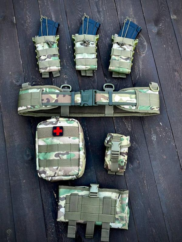 В комплекті Розвантажувальний ремінь РПС факсекс 1 шт Тактична сумка для сбросу пустих магазинів 1 шт Нейлоновий підсумок для тактичної аптечки 1 шт Підсумок з пластиковими боками для АК 3 шт Підсумок під гранату 1 шт 1.Розвантажувальний ремінь РПС Без плечиків!!! Довжина ременя регулюється від 110 см до 95 см. Розмір підкладки 90*10 см РПС оснащений кріпленнями для подальшого використання плечиків та ремнем "фастексах" на магнітній застібці. Ремінь змінний. В середину вшита помякшуюча підкладка що слугує додатковим демфером. РПС оснащений дихаючою 3D сіткою з внутрішньої сторони, що робить його більш комфортнішим у використанні. С зовнішньої сторони система моллі з міцної та надійної поліамідної стропи, для кріплення підсумків та іншого додаткового спорядження. Все прошито армованими нитками, що підвищує термін служби виробу. 2Тактична сумка для сбросу пустих магазинів. Розмір: 27 х 25 см Виготовлена з водонепроникної тканин Оксфорд 600D, якісна фурнітура, система молі. 3 Нейлоновий підсумок для тактичної аптечки Характеристики: Матеріал: Водонепроникна міцна тканина 600d Кріплення: на стегно, MOLLE Зовнішні габарити: 19 см х 16 см х 10 см 4 Підсумок з боками призначається для носіння одного магазину АК або М16, як на розвантажувальних жилетах і бронежилетах, так і на будь-якому спорядженні, оснащеному кріпленням MOLLE. На звороті підсумка розташоване кріплення MOLLE з фіксацією ремінців на кнопці. Матеріал Cordura 16×7×3,5 см