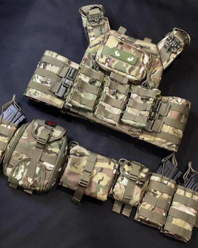 Плитоноска швидкого скидання+ РПС та 10 підсумків Комплект: -Плитоноска з системою швидкого скидання; 1 -каркасний підсумок під магазини Зшт; -нагрудна сумка; 1 ши -РПС з ременем "кобра 1 шт -підсумок під аптечку з системою швидкого скидання; 1 шт -сумка для скиду; 1 шт -підсумок під гранату; 1 шт -одинарний підсумок під магазини 3 шт. Плитоноска під плиту 25×30см, 4х точечна система швидкого скиданя, та бокові кармани •під балістичний пакет 15×30 см -Розмір плитоноски регулюється. -3 середини 3D сітка та пом'якшуюча підкладка, що слугує додатковим демпфером. -Оснащена евукаційною ручкою.
