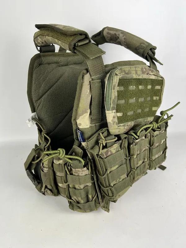 Плитоноска CORDURA 1000D Характеристики: Система MOLLE по всей поверхности жилета. Комплектация: - Подсумки под автоматные магазины 4 шт - Под гранату 1 шт - Под рацию 1 шт - Под аптечку 1 шт. - Под плиты 25*30см, спереди и сзади. Регулируется по обхвату и высоте. Грудная часть жилета и спина оборудованы демпферной дышащей сетчатой тканью. Размер: универсальный Цвет: камуфляж Вес: 1,4 кг.