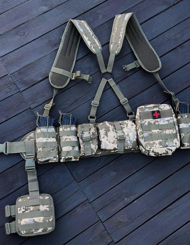 В комплекті -РПС з ременем на фастексі з функцією "lock" 1 шт -підсумок під аптечку 1 шт -сумка для скиду 1 шт -підсумок під гранату 1 шт -підсумки під магазини , 3 шт; -плечові лямки 1 шт Платформа стегнова 1 шт Довжина ременя регулюється від 125 см до 95 см,ширина 5 см. Розмір підкладки 90х15 см РПС оснащений кріпленнями ремнем на фастексі з системою "Lock". Ремінь змінний. В середину вшита помякшуюча підкладка що слугує додатковим демфером. РПС оснащений дихаючою 3D сіткою з внутрішньої сторони,що робить його більш комфортнішим у використанні. Зовнішня сторона оснащення системою моллі з міцної та надійної поліамідної стропи, для кріплення підсумків та іншого додаткового спорядження. Для пошиву використовується щільна, водовідштовхувальна тканина Кордура 900D. Все прошито армованими нитками, що підвищує термін служби виробу.