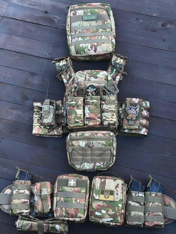 Увага важлива інформація Шеврони в поставку не входять До комплекту входять: •плитоноска •тройний підсумок під АК •РПС з міцним ремнем на фастексі з функцією "lock •рюкзак •напашник •під гранату •під рацію •під телефон •сумка скиду •аптечка •утилітарний підсумок •під АК, 3шт Під плиту 25×30 см Має 4х точечну системою швидкого скидання та бокові кишені під балістичний пакет 15×30см Зʼємна передня Molle панель яка кріпиться до основи на Velcro та двома карабінами Кишеня на вологозахисній блискавці Регулюється на плечах та по об'єму Внутрішня частина оснащена 3D сіткою Плечові лямки мають сестему моллі Кріплення для трубки гідратора Посилена евукаційна ручка Камербанди з’ємні,кріпляться з обох сторін до плитоноски за допомогою великих велкро- панелей Бронеплити вставляються знизу,фіксуються широкою системою липучок З низу плитоноски 4 D-кільця Виготовлена з міцної, водонепроникної тканини Кордура 900D Прошивка армованими нитками