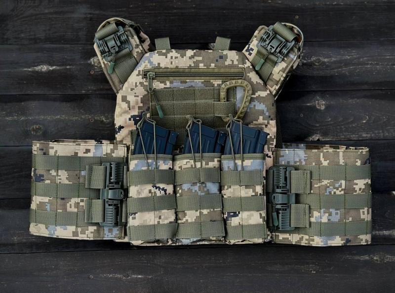 Звертаємо Вашу увагу, що фурнітура може відрізнятись по кольору , в залежності від партіі поставки. В комплекті плитоноска 1 шт Тройний підсумок під магазини 1 шт бокові кармани під м'які балістичні пакети 15*30 см Якісна плитоноска за стандартом НАТО оснащена боковою та верхньою системою швидкого скидання, під плиту 25×30 см. - Розмір плитоноски універсальний, регулюється на плечах та по об'єму від М до XXL. - З середини прошита 3D сіткою та пом'якшуючою підкладкою, що слугує додатковим демпфером. - Позаду оснащена евукаційною ручкою. - По верху прошита системою Molle, що дозволяє кріпити будь-які підсумки та інше додаткове спорядження. - По переду вшитий додатковий карман на блискавці для особистих потреб. - Бронеплити вставляються знизу та фіксуються широкою системою липучок, що не дасть вашим плитам випасти чи протерти кріплення. Виготовлена з міцної, водонепроникної тканини кордура. Для пошиву використовується поліамідна стропа. Для її виготовлення використовується стійкий до зносу, суперміцний, високоякісний поліамід. Має відмінні властивості: високий рівень міцності, надійна, зможе витримати великі навантаження, стійка до негативного впливу ультрафіолету, вологи, високих/низьких температур, довговічна. Відповідає вимогам вітчизняних стандартів якості. Плитоноска прошита армованими нитками, що підвищує термін служби виробу.