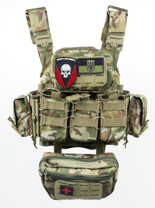 Шеврони в комплект не входять ! В комплекті Плитоноска 1 шт Підсумока для АК 3 шт Напашник 1 шт Улітарний підсумок 1 шт Підсумок під гранату 2 шт сумісний з плитами розміром 25х30см Бокові кармани під балістичні пакети 25x15 матеріал: Cordura 1000D з IRR просоченням. Не контрастує у ПНВ 2 та 3 поколінь Система швидкого скидання 3D вентиляція для підвищення комфорту текстильні застібки виробництва Velkro регулювання по висоті для розмірів S/XL регулювання камербанду по об’єму для розмірів S/XL еластична вставка на камербанді передня частина має карман для особистих речей м’які панелі для кріплення ідентифікаторів та пачів