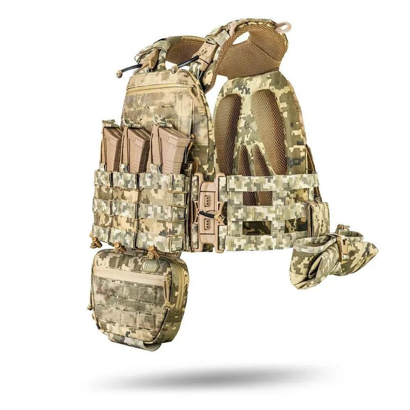 Під плити розміром 25 на 30 см. Камербанд Скелетний Обхват грудей: 86–134 см Рекомендовані розміри одягу: XS / S / M / L / XL / XXL У комплекті всі підсумки в колір плитоноски: Плитоноска М7 PRO gen 2 Змінна передня панель (1 шт) Підсумок під магазин АК/AR (3 шт) Сумка-напашник М7 (1 шт) Підсумок під гранату (1 шт) Підсумок для скидання магазинів AK/AR (1 шт) Аптечний підсумок М8 (1 шт) Обирайте розмір по обхвату грудей в екіпіруванні (з формою, флісом, бушлатом). Якщо сумніваєтесь, оберайте трохи більше: буде комфортніше і не стягуватиме. Характеристики Тканина Cordura 1000d з IRR просоченням Стропа Поліамід 100% Швидкоскиди M2 Spider Coyote Brown Система кріплення спорядження MOLLE / VELCRO Наявність кишені під бічну захист Так, опціонально Під плити розміром 25 на 30 см. Фурнітура Max Zip та Woojin Стропа для евакуації Так, система Pro 80см Кріплення на плечах MOLLE / VELCRO Можливість встановити напашник та фартух Так Демфер на внутрішній частині Змінна система М8 Каучук K-FLEX ST DUCT NET AD 12мм Нитки Amann Strongbond 40 Німеччина Можливість встановлювати модульні панелі Так Поліпшене кріплення захисту шиї – тепер не блокує доступ до передньої адміністративної кишені. Можна працювати з картами, планшетами чи документами навіть із закріпленою бронею на шиї. ⠀ Кріплення захисту попереку - без ризику! - кишеня під плиту не перекривається. Захист став надійнішим без втрати функціональності. ⠀ Швидкоскиди 2M Spider – новий рівень – працюють однією рукою, навіть у рукавичках та у повній темряві. Тихо, швидко та надійно. Змінні передні панелі швидко змінюються під завдання: штурм, патруль, CQB або робота в тилу. Менше часу на налаштування — більше виконання завдання. ⠀ Нова ергономіка плечей — не натирає, рівномірно розподіляє вагу навіть за повного бойового комплекту. Перевірено практично. Нова система регулювання плечей - тепер на велкро з мітками. Швидке і точне підстроювання без здогадів і переробок. Що залишилося незмінним: – Cordura 1000D – надміцний та зносостійкий матеріал – Жакардова поліамідна стропа – надійність та довговічність – Топова фурнітура та блискавки – St0ong перевірене часом та фронтом