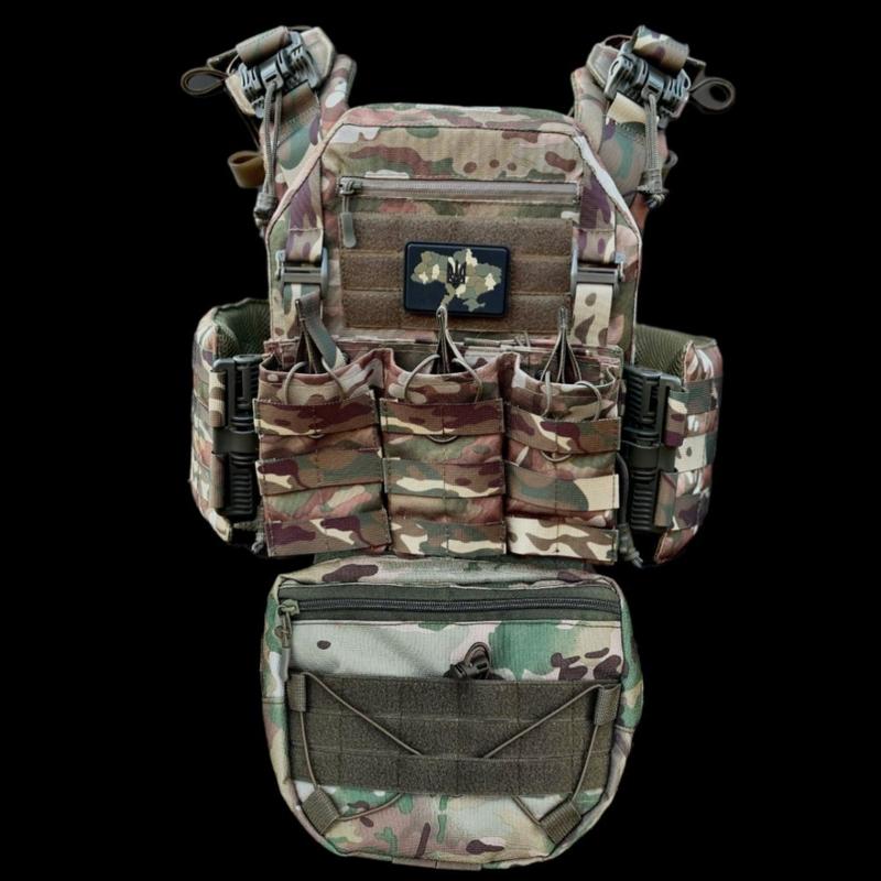 Увага важлива інформація шеврон не входить в комплект Комплект -Плитоноска GEN.9 1 шт -тройний підсумок для АК/AR 1 шт -напашник збільшений 25х20 см з карманом під балістичний пакет Під плиту 25×30 см Має 4х точечну системою швидкого скидання та бокові кишені під балістичний пакет 15×30см -Зʼємна передня Molle панель яка кріпиться до основи на Velcro та двома карабінами -Посилена велкро панель над клапаном -Кишеня на вологозахисній блискавці -Регулюється на плечах та по об'єму -Внутрішня частина оснащена 3D сіткою -Плечові лямки посилені додатковим демпфером,мають сестему моллі -Кріплення для трубки гідратора -Посилена евукаційна ручка -Камербанди з’ємні,кріпляться з обох сторін до плитоноски за допомогою великих велкро-панелей -На задній частині камербандів вставки у вигляді подвійної резинки для додаткової еластичності -З низу плитоноски 4 D-кільця -Бронеплити вставляються знизу,фіксуються широкою системою липучок -Виготовлена з міцної, водонепроникної тканини Кордура 900D -Надміцна поліамідна стропа -Прошивка армованими нитками