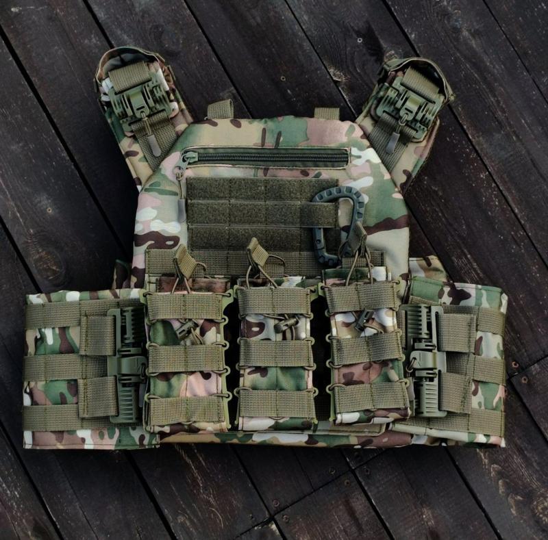 Звертаємо Вашу увагу, що фурнітура може відрізнятись , в залежності від партіі поставки. В комплекті плитоноска 1 шт Підсумок з пластиковими боками для АК 3 шт бокові кармани під м'які балістичні пакети 15*30 см Якісна плитоноска за стандартом НАТО оснащена боковою та верхньою системою швидкого скидання, під плиту 25×30 см. - Розмір плитоноски універсальний, регулюється на плечах та по об'єму від М до XXL. - З середини прошита 3D сіткою та пом'якшуючою підкладкою, що слугує додатковим демпфером. - Позаду оснащена евукаційною ручкою. - По верху прошита системою Molle, що дозволяє кріпити будь-які підсумки та інше додаткове спорядження. - По переду вшитий додатковий карман на блискавці для особистих потреб. - Бронеплити вставляються знизу та фіксуються широкою системою липучок, що не дасть вашим плитам випасти чи протерти кріплення. Виготовлена з міцної, водонепроникної тканини кордура. Для пошиву використовується поліамідна стропа. Для її виготовлення використовується стійкий до зносу, суперміцний, високоякісний поліамід. Має відмінні властивості: високий рівень міцності, надійна, зможе витримати великі навантаження, стійка до негативного впливу ультрафіолету, вологи, високих/низьких температур, довговічна. Відповідає вимогам вітчизняних стандартів якості. Плитоноска прошита армованими нитками, що підвищує термін служби виробу