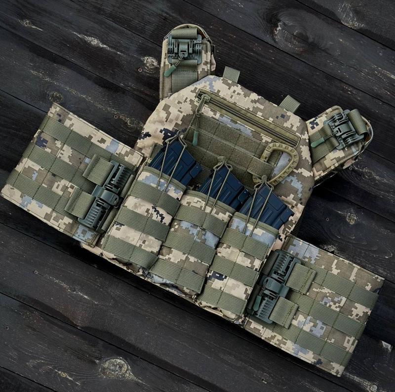 Звертаємо Вашу увагу, що фурнітура може відрізнятись , в залежності від партіі поставки. Магазини для АК не входять в комплект В комплекті плитоноска 1 шт Тройний підсумок під магазини 1 шт бокові кармани під м'які балістичні пакети 15*30 см Якісна плитоноска за стандартом НАТО оснащена боковою та верхньою системою швидкого скидання, під плиту 25×30 см. - Розмір плитоноски універсальний, регулюється на плечах та по об'єму від М до XXL. - З середини прошита 3D сіткою та пом'якшуючою підкладкою, що слугує додатковим демпфером. - Позаду оснащена евукаційною ручкою. - По верху прошита системою Molle, що дозволяє кріпити будь-які підсумки та інше додаткове спорядження. - По переду вшитий додатковий карман на блискавці для особистих потреб. - Бронеплити вставляються знизу та фіксуються широкою системою липучок, що не дасть вашим плитам випасти чи протерти кріплення. Виготовлена з міцної, водонепроникної тканини кордура. Для пошиву використовується поліамідна стропа. Для її виготовлення використовується стійкий до зносу, суперміцний, високоякісний поліамід. Має відмінні властивості: високий рівень міцності, надійна, зможе витримати великі навантаження, стійка до негативного впливу ультрафіолету, вологи, високих/низьких температур, довговічна. Відповідає вимогам вітчизняних стандартів якості. Плитоноска прошита армованими нитками, що підвищує термін служби виробу