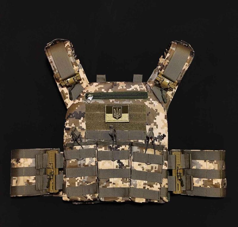 В комплекті плитоноска 1 шт Тройний підсумок під магазини 1 шт бокові кармани під м'які балістичні пакети 15*30 см Якісна плитоноска за стандартом НАТО оснащена боковою та верхньою системою швидкого скидання, під плиту 25×30 см. - Розмір плитоноски універсальний, регулюється на плечах та по об'єму від М до XXL. - З середини прошита 3D сіткою та пом'якшуючою підкладкою, що слугує додатковим демпфером. - Позаду оснащена евукаційною ручкою. - По верху прошита системою Molle, що дозволяє кріпити будь-які підсумки та інше додаткове спорядження. - По переду вшитий додатковий карман на блискавці для особистих потреб. - Бронеплити вставляються знизу та фіксуються широкою системою липучок, що не дасть вашим плитам випасти чи протерти кріплення. Виготовлена з міцної, водонепроникної тканини кордура. Для пошиву використовується поліамідна стропа. Для її виготовлення використовується стійкий до зносу, суперміцний, високоякісний поліамід. Має відмінні властивості: високий рівень міцності, надійна, зможе витримати великі навантаження, стійка до негативного впливу ультрафіолету, вологи, високих/низьких температур, довговічна. Відповідає вимогам вітчизняних стандартів якості. Плитоноска прошита армованими нитками, що підвищує термін служби виробу.