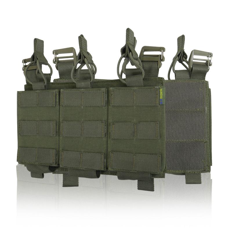 З'ємна передня панель з 3-ма підсумками під магазини для плитоноски - функціональна з'ємна панель з трьома підсумками під 3 магазин забезпечує зберігання та швидкий доступу до 3-х магазинів серії АК/AR/РПК під час виконання бойових задач. Панель легко кріпиться на передню частину плитоноски, забезпечуючи зручне та ефективне перезаряджання. Виготовлена з Cordura 1000D щільністю 380 г/м² з NIR-просоченням, що робить панель менш помітною у приладах нічного бачення, має подвійне поліуретанове покриття, яке забезпечує захист від вологи та мастильних матеріалів, не підтримує горіння, стійкий до стирання та вигоряння на сонці, що дозволяє зберігати його властивості в екстремальних умовах. Розмір: 25х15 см Фурнітура: Пластикові рамки з замком від японського виробника WJ у формі D-кільця слугують з'єднувальним елементом у поєднанні з велкро липучкою, що дозволяє швидко прикріпити або зняти панель з плитоноски. Надійне кріплення: Магазини фіксуються за допомогою еластичної резинки та страхової стропи з «вушками», що гарантують надійний захист від випадання. Низ підсумка закріплений 5 см стропою, яка надійно пришита та запобігає випаданню магазинів. Ефективне видалення води та бруду: Отвори на нижній частині підсумка забезпечують швидке видалення будь-якого бруду або води, що може потрапити всередину. Оптимальна конструкція: Робоча поверхня хвату магазина залишається відкритою, що дозволяє швидко здійснювати маніпуляції. Для додаткової міцності, підсумок має пластикові вставки з боків і спереду, а також посилену основу з пластику та Cordura. Додаткові можливості: Дві петлі зі стропи внизу панелі дозволяють кріпити додаткове спорядження.