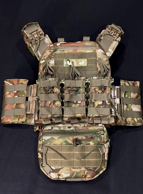 ## Плитоноска швидкого скидання + 3 підсумка та Напашник Мультикам для балістичних плит VE-33 Звертаємо Вашу увагу, що фурнітура може відрізнятись по кольору, в залежності від партіі поставки. В комплекті плитоноска 1 шт підсумкок під магазини АК з пластиковими боками 3 шт Напашник 1 шт Шеврон очі мультикам 1 шт бокові кармани під м'які балістичні пакети 15*30 см Якісна плитоноска за стандартом НАТО оснащена боковою та верхньою системою швидкого скидання, під плиту 25×30 см. - Розмір плитоноски універсальний, регулюється на плечах та по об'єму від М до XXL. - З середини прошита 3D сіткою та пом'якшуючою підкладкою, що слугує додатковим демпфером. - Позаду оснащена евукаційною ручкою. - По верху прошита системою Molle, що дозволяє кріпити будь-які підсумки та інше додаткове спорядження. - По переду вшитий додатковий карман на блискавці для особистих потреб. - Бронеплити вставляються знизу та фіксуються широкою системою липучок, що не дасть вашим плитам випасти чи протерти кріплення. Виготовлена з міцної, водонепроникної тканини Кордура 900D. Для пошиву використовується поліамідна стропа. Для її виготовлення використовується стійкий до зносу, суперміцний, високоякісний поліамід. Має відмінні властивості: високий рівень міцності, надійна, зможе витримати великі навантаження, стійка до негативного впливу ультрафіолету, вологи, високих/низьких температур, довговічна. Відповідає вимогам вітчизняних стандартів якості. Плитоноска прошита армованими нитками, що підвищує термін служби виробу. Встигніть замовити, кількість штук за акцією обмежена! Остерігайтеся підробок і низькоякісного товару, його зараз дуже багато представлено під видом opигiнaлy! Ми пропонуємо найвищу добротну якість товару на ринку України, який виконує свою функцію та від якого ви отримуватиме тільки приємні емоції. Чому купують саме у нас? Відгуки та рекомендації реальних клієнтів Наш магазин має численні позитивні відгуки від задоволених клієнтів. Ви можете ознайомитися з їхнім досвідом і рекомендаціями в описі нижче та на нашому сайті, що допоможе вам зробити обґрунтований вибір. Прозорість і чесність Ми ведемо відкриту і чесну політику у відносинах з клієнтами і завжди йдемо на зустріч. Усі характеристики товарів, умови гарантії та обміну чітко вказані на нашому сайті, що дозволяє уникнути непорозумінь та забезпечує довіру клієнтів. Легка система повернення товарів Ми розуміємо, що іноді товар може не підійти Вам по тим чи іншим причинам. Тому ми пропонуємо гнучку та прозору систему повернення товарів, що забезпечує вам спокій і впевненість у вашій покупці. Високий рівень обслуговування клієнтів, 10 років досвіду Наші фахівці завжди готові надати професійну консультацію та допомогу у виборі товару. Ми цінуємо кожного клієнта і прагнемо зробити процес покупки максимально комфортним і приємним. Швидка доставка та зручні умови оплати Ми пропонуємо швидку та надійну доставку по всій країні, а також різноманітні способи оплати, включаючи готівковий і безготівковий розрахунок. Наші клієнти можуть обрати найзручніший для себе спосіб отримання товару. ✅ Весь товар перевіряється на наявність браку перед відправленням ✅ Відгуки наших клієнтів Поквапся, товару за акцією залишилося всього 3шт! ✅ З турботою про кожного клієнта ✅ ДОСТАВКА ПО всій УКРАЇНІ: Ми якісно та надійн