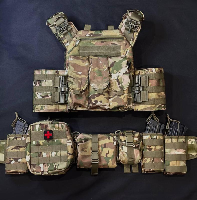 ## Комплект плитоноски быстрого сброса с боковыми карманами + РПС и 7 Подсумоков - плита 25×30 см VE-33 Шевроны в комплект не входят! В комплекте плитоноска 1 шт Тройный закрытый подсумок под магазины АК 1 шт подсумок ординарный для АК 3 шт< br />подсумок под гранату 1 шт подсумок для сброса 1 шт РПС Кобра без плечиков 1 шт Аптечка 1 шт Качественная плитоноска по стандарту НАТО оснащена боковой и верхней системой быстрого сброса, под плиту 25×30 см. боковые карманы под мягкие баллистические пакеты 15*30 см - Размер плитоноски универсален, регулируется на плечах и по объема от М до XXL. - С середины прошита 3D сеткой и смягчающей подкладкой, служащей дополнительным демпфером. - Позади оснащена эвукационной ручкой. - По верху прошита системой Molle, что позволяет крепить любые подсумоки и другое дополнительное снаряжение. - По переду вшитая дополнительная карман на молнии для личных нужд. - Бронеплиты вставляются снизу и фиксируются широкой системой липучек, что не даст вашим плитам выпасть или протереть крепеж. Изготовленная из прочной, водонепроницаемой ткани кордура. Для пошива используется полиамидная стропа. Для ее изготовления используется стойкий к износу, суперпрочный, высококачественный полиамид. Обладает отличными свойствами: высокий уровень прочности, надежный, сможет выдержать большие нагрузки, устойчив к негативному воздействию ультрафиолета, влаги, высоких/низких температур, долговечен. Соответствует требованиям отечественных стандартов качества. Плитоноска прошита армированными нитями, что повышает срок службы изделия. Успейте заказать, количество штук по акции ограничено! Остерегайтесь подделок и низкокачественного товара, его сейчас очень много представлено под видом oригинaлa! Мы предлагаем высочайшее добротное качество товара на рынке Украины, который выполняет свою функцию и от которого вы будете получать только приятные эмоции. Почему покупают именно у нас? Отзывы и рекомендации реальных клиентов Наш магазин имеет многочисленные положительные отзывы от довольных клиентов. Вы можете ознакомиться с их опытом и рекомендациями в описании ниже и на нашем сайте, что поможет вам сделать обоснованный выбор. Прозрачность и честность Мы ведем открытую и честную политику в отношениях с клиентами и всегда идем навстречу. Все характеристики товаров, условия гарантии и обмена четко указаны на нашем сайте, что позволяет избежать недоразумений и обеспечивает доверие клиентов. Легкая система возврата товаров Мы понимаем, что иногда товар может не подойти Вам по тем или иным причинам. Поэтому мы предлагаем гибкую и прозрачную систему возврата товаров, что обеспечивает вам спокойствие и уверенность в вашей покупке. Высокий уровень обслуживания клиентов, 10 лет опыта Наши специалисты всегда готовы предоставить профессиональную консультацию и помощь в выборе товара. Мы ценим каждого клиента и стремимся сделать процесс покупки максимально комфортным и приятным. Быстрая доставка и удобные условия оплаты Мы предлагаем быструю и надежную доставку по всей стране, а также разнообразные способы оплаты, включая наличный и безналичный расчет. Наши клиенты могут выбрать наиболее удобный для себя способ получения товара. ✅ Весь товар проверяется на наличие брака перед отправкой ✅ Отзывы наших клиентов Поторопись, товара по акции осталос