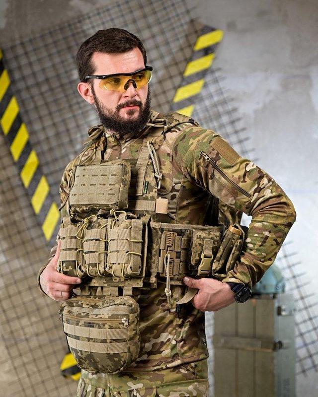 Плитоноска с системой быстрого сброса Материал: Cordura 1000D Характеристики: Комплектация: Результаты под автоматные магазины 5 шт, рюкзак 1шт аптечка 1шт напашник 1шт Интерфейс: Система MOLLE по всей поверхности жилета Под плиты 25*30см, спереди и сзади. Регулируется по обхвату и высоте. Грудная часть жилета и спина оборудованы демпферной сетчатой тканью.