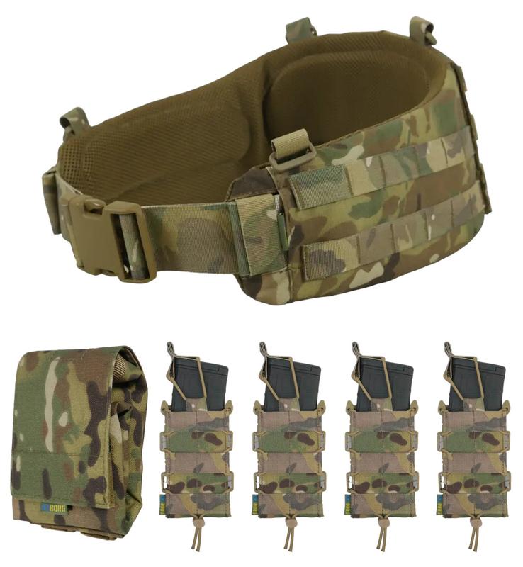 Набір включає широкий тактичний пояс РПС Kiborg R-1 GEN.2 + підсумки - анатомічної форми у розмірі S та підсумки, що забезпечують зручність і функціональність для оперативного виконання завдань у бойових умовах. Це оптимальний вибір для професійного використання, що дозволяє розмістити необхідне спорядження завдяки системі MOLLE. Комплектація набору - Пояс Kiborg R-1 GEN.2 (S): виготовлений з матеріалу Cordura Nylon 1000D із IRR-покриттям для захисту у приладах нічного бачення, стійка до механічних навантажень, водонепроникна та вогнестійка. Внутрішня сторона: демпферна 3D-сітка генерації А-1 із поліфомом 10 мм для вентиляції, амортизації та зниження тиску. Система MOLLE: 2 ряди MOLLE на бокових частинах. 4 ряди MOLLE на задній частині для кріплення спорядження. Особливості: карман на велкро для балістичного пакета (не входить у комплект). Жорсткі пластикові вставки для збереження форми поясу. Точки кріплення для лямок, що дозволяють перетворити пояс на РПС. - 4 підсумки під магазин: модель KIBORG GU Single Mag Pouch Multicam. Сумісність із MOLLE-системою для фіксації на поясі. Виготовлені з Cordura 1000D. Підходять для розміщення одного магазину стандартного розміру. - Підсумок для скидання порожніх магазинів: виготовлений з міцного матеріалу Cordura 1000D із кріпленням MOLLE, містка сумка для швидкого скидання відпрацьованих магазинів. Компактність і зручність у використанні. Особливості та переваги набору - Універсальність: система регулюється по обхвату та дозволяє адаптувати пояс під різний тип спорядження. - Ергономічність: анатомічний крій пояса забезпечує комфорт під час активного руху та тривалого носіння. - Додатковий захист: можливість інтеграції балістичного пакета для захисту поясниці. - Надійність: використання преміальних матеріалів (Cordura, Woojin Plastic) гарантує довговічність. - Функціональність: включені підсумки дозволяють повністю підготувати пояс для виконання тактичних завдань.