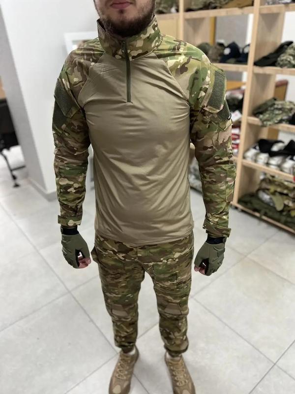 Тактичний літній костюм форма Ubacs з наколінниками та налокітниками Розміри: S, M, L, XL, XXL, 3XL. наявність розмірів уточнюйте у менеджерів-консультантів Тактичний бойовий костюм мультикам з еластичними вставками, армійська тактична форма з наколінниками та налокітниками. Сорочка тактична UBACS просто незамінна при необхідності носіння бронежилета або розвантажувальної системи (жилету). Виготовлена з матеріалу, що містить 35% бавовни та 65% поліестеру. Коротка застібка - блискавка від горла до грудей прикрита тканиною. Комір - стоєчка. Унікальність сорочці надає камуфляжне забарвлення рукавів "мультикам". Ця українська розробка вже неодноразово показала свої переваги під час тестування. Нарукавні кишені застібаються збоку на блискавці і мають липучки для кріплення шевронів. За їх відсутності липучки закриваються накладками. Всі липучки та застібки мають колір схожий з основною тканиною сорочки. Для ліктьових амортизаційних вставок передбачено кишені на "велкро". Комплект польової та повсякденної літньої форми, завдання якого полягає у забезпеченні підвищеного рівня комфорту. Зокрема, при носінні бронежилетів та розвантажувальних систем, коли основна частина торса закрита та погано вентилюється. Штани можуть використовуватися на тренуваннях, стрільбищах, прогулянках та походах, а також для щоденного носіння. Ця модель виготовлена із міцної тканини ріп-стоп. Така тканина стійка до зношування і добре пропускає повітря. Вони зручно бігати, стрибати, присідати та пересуватися у польових умовах. Характеристики: - Тип: форма тактична - Вигляд: маскувальний - Еластичний ультрагнучкий торс - Матеріал: 35% бавовна та 65% поліестер (Ріп-стоп) - Колір: мультикам (Multicam) - Сезон: весна/літо/осінь - Вид виробу: Костюм - Категорії: Для військовослужбовців - Стан: Новий - Анатомічний крій - Склад: 35% високоякісної бавовни ріп стоп та 65% поліестеру. - Властивості тканини: водовідштовхувальна, міцна, не линяє і не вицвітає, дихаюча Комплект: - сорочка убокс, - штани, - налокітники та наколінники