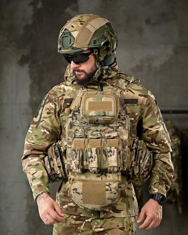 Матеріал: Cordura 1000D - Інтерфейс: Розширена передня панель з адміністративним підсумком. Передня панель з можливістю розмістити 7 магазинів АК, AR Сумка-напашник з резинкою під турнікет Лазерна різка Система MOLLE по всій поверхні жилета, Підсумки під автоматні магазини з системою MOLLE, Еластичний пояс жилета з підсумками на 4 магазини АК, AR, рацію або турнікет, з кожного боку - Подвійна стінка жилета, під бронеплиту та під додаткову балістичну захисту - Чохол для бронежилета, призначений для перенесення бронеплит стандартних розмірів 25*30см, спереду і ззаду. - Передня та задня сторони жилета оснащені системою MOLLE, яка розширює обладнання - Передня та задня сторони жилета Снімні і мають велкро панелі, можна модернізувати жилет, передню робочу панель можна змінювати на більш розширену, з більшим функціоналом, також вона додатково кріпиться за допомогою швидкоз’ємних фастексів. - На передніх і задніх частинах чохла розміщені велкро панелі для патчів з системою MOLLE - По всій площі жилет обшитий стропами системи MOLLE, що дає можливість переносити, у зручному положенні підсумки і спорядження. - Регулюється за обхватом і висотою. - Снімний пояс - Швидкоз’ємний пояс і плечові ремені жилета - Також плечові ремені обладнані додатковими чохлами для комфортної носки жилета з системою MOLLE - Грудна частина жилета і спина обладнані демпферною дихаючою сітчастою тканиною
