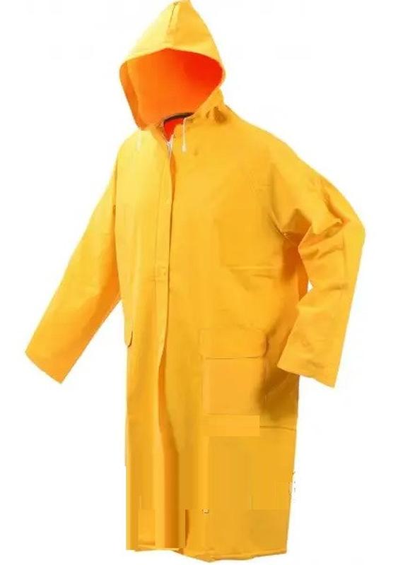 Жовтий плащ VOREL-74633 з двома великими кишенями та регульованим капюшоном. Суміш ПВХ та поліестеру є водонепроникним та повітронепроникним матеріалом. Надмірне тепло йде з-під матеріалу через вентиляційні прорізи на спині та пахвами. - розмір ХХХL - зріст 204-212 см - розмір грудної клітки 126-134 см - матеріал 70% ПВХ, 30% поліестер - колір жовтий - тип застібки блискавка, кнопки, шнурки - категорія захисту І - вентиляційні отвори - кількість кишень 2 зовнішніх - дві великі кишені прикриті клапаном