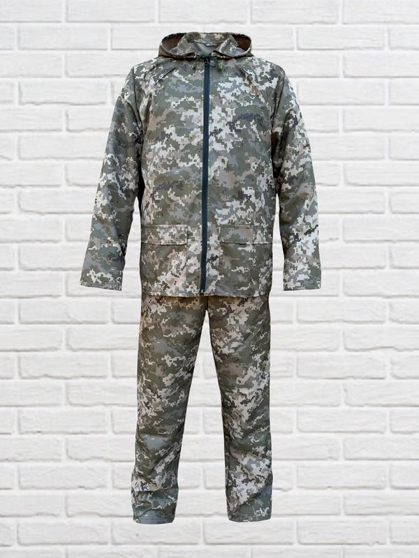 Костюм дощовик підійде любителям туризму, полювання та риболовлі, а також для страйкболістів Дозволяє сховатися від опадів без потреби тримати парасольку в руках. Вільний крій дозволяє легко одягати його поверх основного одягу і не сковує рухів. Лісне забарвлення камуфляжу забезпечує прекрасну маскування практично на будь-якій місцевості. Виготовляється дощовик поліестеру - доббі. Для забезпечення вологозахисту в костюмі проклеєні шви. Костюм дощовик, що складається з куртки та штанів. Куртка на застібці блискавка з захисною планкою, з капішоном і двома кишенями. Штани пояс на резинці з двома наскрізними кишенями. Комплектується чохлом для зберігання. Розміри: XS-S (46-48), M-L (50-52), L-XL (54-56), XL-2XL (58-60).