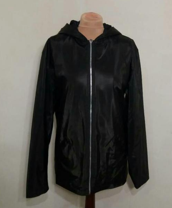 Куртка чорна з м'яким переливом прямого силуету з тканини з поліуретановим покриттям, з капюшоном (не відстібається), на металевій блискавці, утеплена тонким синтепоном, є дві кишені. Прекрасний захист від дощу та вітру. Тканина: поліуретанове просочення Розмір: 176/14 Стан: відмінне ДВиробу= 71см ДР=59 см ПОГ= 56см Ціна: 650 грн.