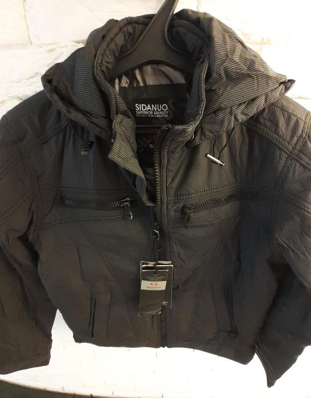Новая демисезонная куртка китайского производителя на одинарном синедепоне пристойное хорошее качество пошива.Колир черный в серую полоску.Капюшон отстегивается.Размер 46.Доп.мерки ПОГ 55см.Плечи 45см.Дл.рук.по спине 85см. Дл.куртки 64см.