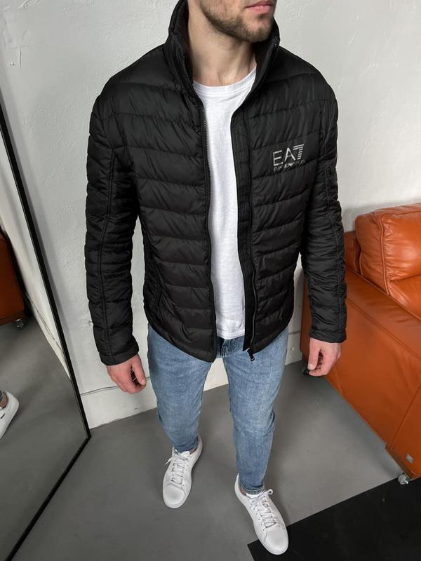 Куртка коротка ЕА7 Ціна - 1500 грн Основна тканина: поліестер, утеплювач: біо пух Розміри S, M, L, XL Куртка чоловіча демісезонна, приталенного крою,з високим комірцем. Стежка основних деталей виконана на спецмашині. Дві зовнішні кижені на застібці-близкавці. Фовко-трафарентний друк логотипу На лівому рукаві фірмовий патч з логотипом Сезон - весна/осінь Комфортна температура від +5