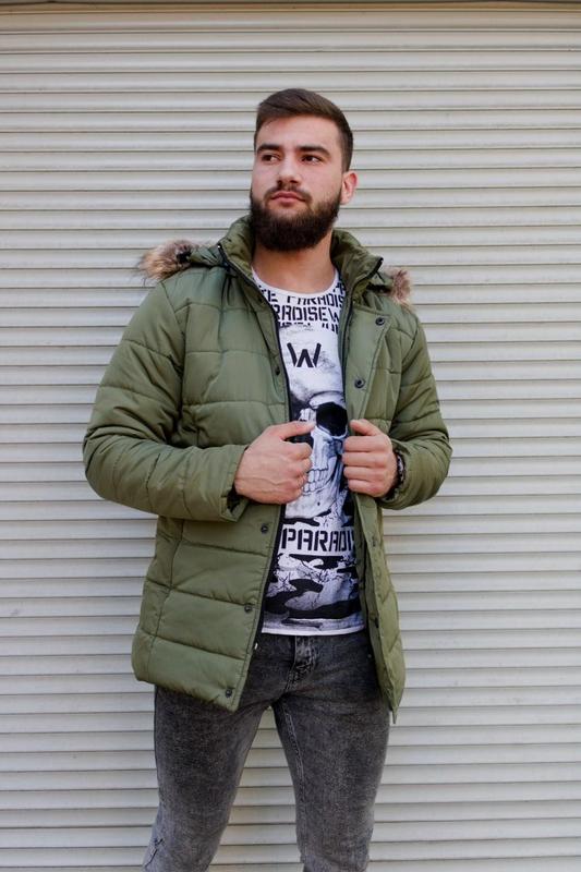 Артикул: 1195 Чоловіча зимова куртка з хутром на капюшоні зелена (хакі) Розміри: M, L, XL (маломірять) Матеріал: плащівка (меморі). утеплювач: синтепон (щільність 250) Бічні кишені на застібках, одна внутрішня кишеня Капюшон відстібається Хутро відстібається. Сезон: Зима