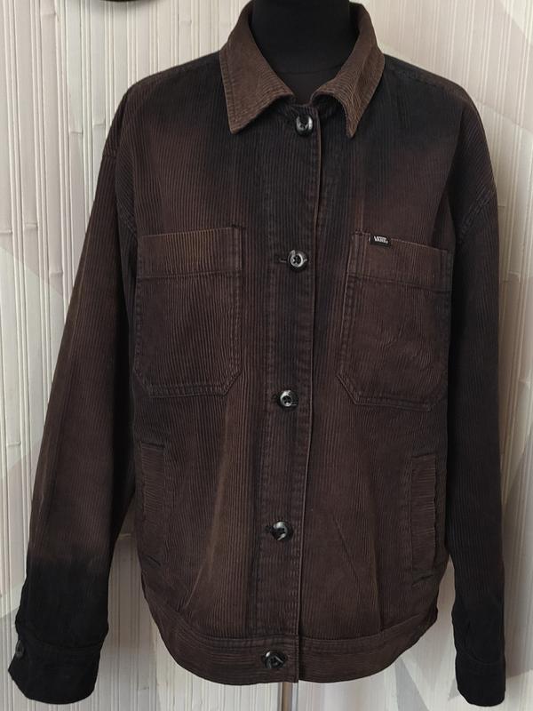 Куртка чоловіча з вельвету, градієнт від чорного до пісочного, відомого бренду Vans, розмір вказано S(44). Нюансів немає. Фото зроблене на манекені розміру S. ПОГ 55, ПОТ 55, ширина по низу 52, довжина виробу по спині без коміра 64, довжина рукава 58, ширина плечей 52 см.