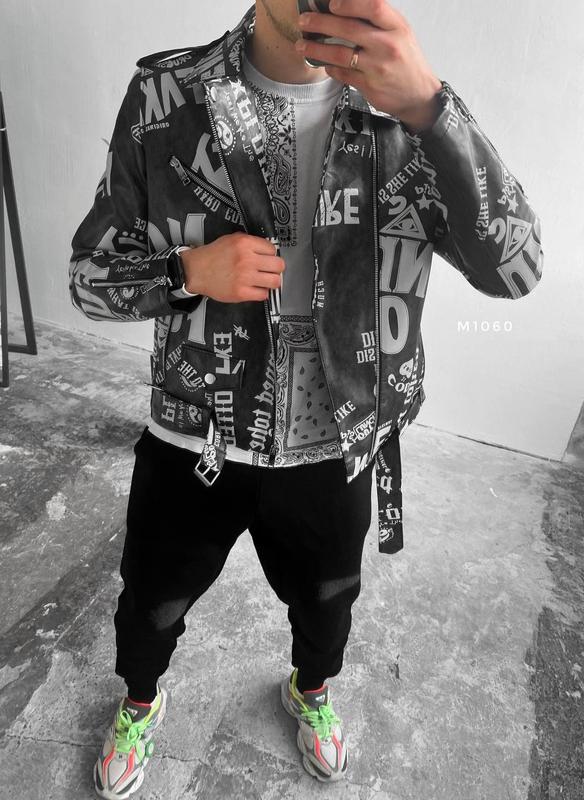 Чорна чоловіча шкіряна куртка з принтом модна косуха для хлопця відмінної якості