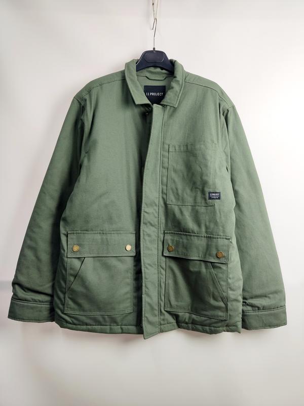 Куртка чоловіча, датський бренд 11Project. Сезон - холодна осінь-тепла зима. Колір хакі. Верх - натуральна бавовна, тіпу денім. Тканина цупка, щільна, має захист від вологи. Застібка - якісна брендована молнія, вітрозахистна планка на кнопках. Силует прямий. Рукава маєть внутрішній трикотажний манжет. Куртка тепла, має утеплювач. Розмір Л плече 52, рукав 66, ПОГ 62, довжина 77
