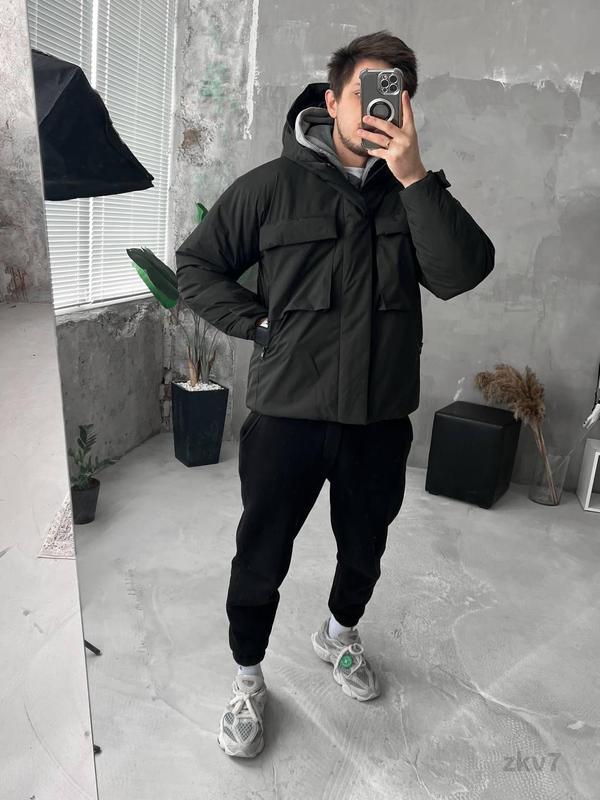 Чоловіча зимова зелена куртка з нагрудними карманами плащівка на мемрані теплий стильний п...